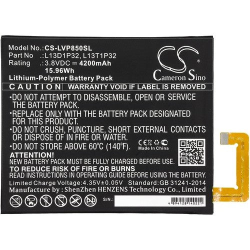 Premium-quality replacement battery for Lenovo L13D1P32 tablet. This aftermarket battery is designed for long-lasting performance and is 100% compatible with Lenovo L13D1P32 equipment. It is manufactured to meet high standards for safety, fit, and function, and is guaranteed to maintain at least 80% of its rated capacity for 12 months from the date of shipment.