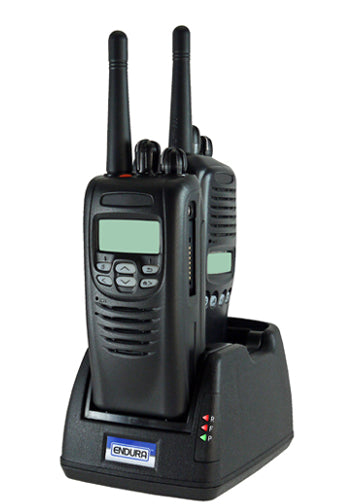 Universal dual bay rapid desk charger with drop-in adapter pods for Ma-Com-Ericsson XG-75P radios and batteries.